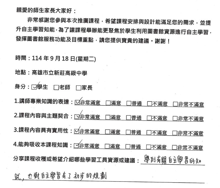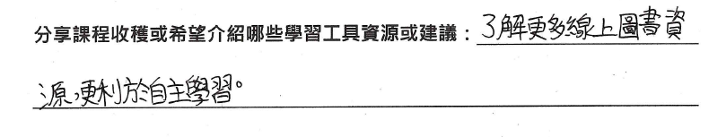 | 問題類別 | 講師專業知識的表達 | 課程內容與主題契合 | 課程內容具有實用性 | 能夠吸收本課程知識 |