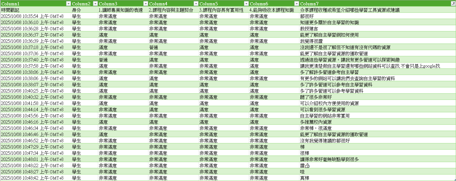 | 問題類別 | 講師專業知識的表達 | 課程內容與主題契合 | 課程內容具有實用性 | 能夠吸收本課程知識 |